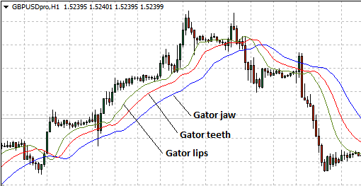 این شاخص به سه خط میانگین حرکتی هموار شده در دوره های زمانی ۱۳، ۸ و ۵ تقسیم بندی می شود که به ترتیب توسط نوارهای ۸، ۵ و ۳ به آینده انتقال پیدا می کنند و با رنگ های آبی، قرمز و سبز مشخص می شوند که نمایانگر آواره، دندان و لب های تمساح هستند.